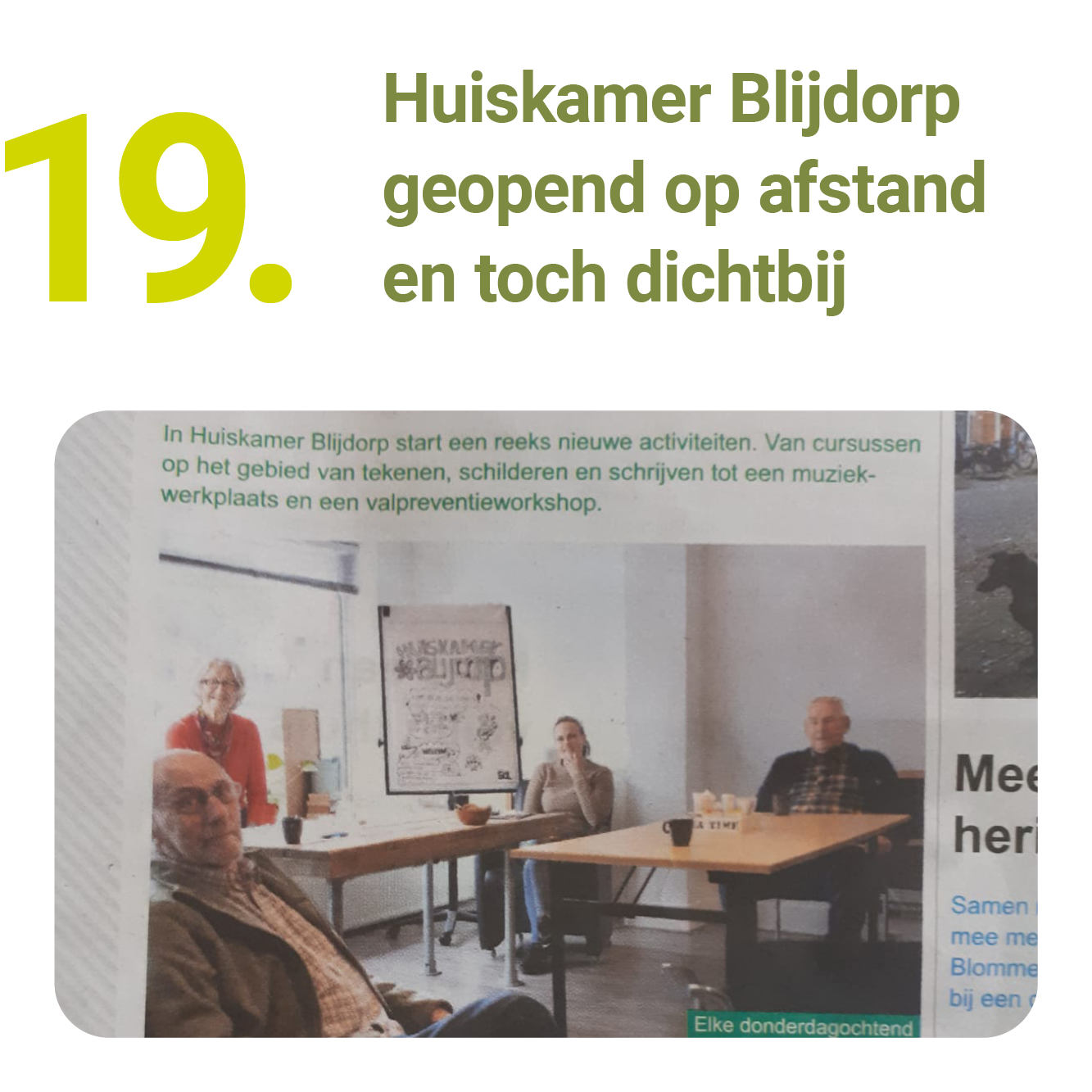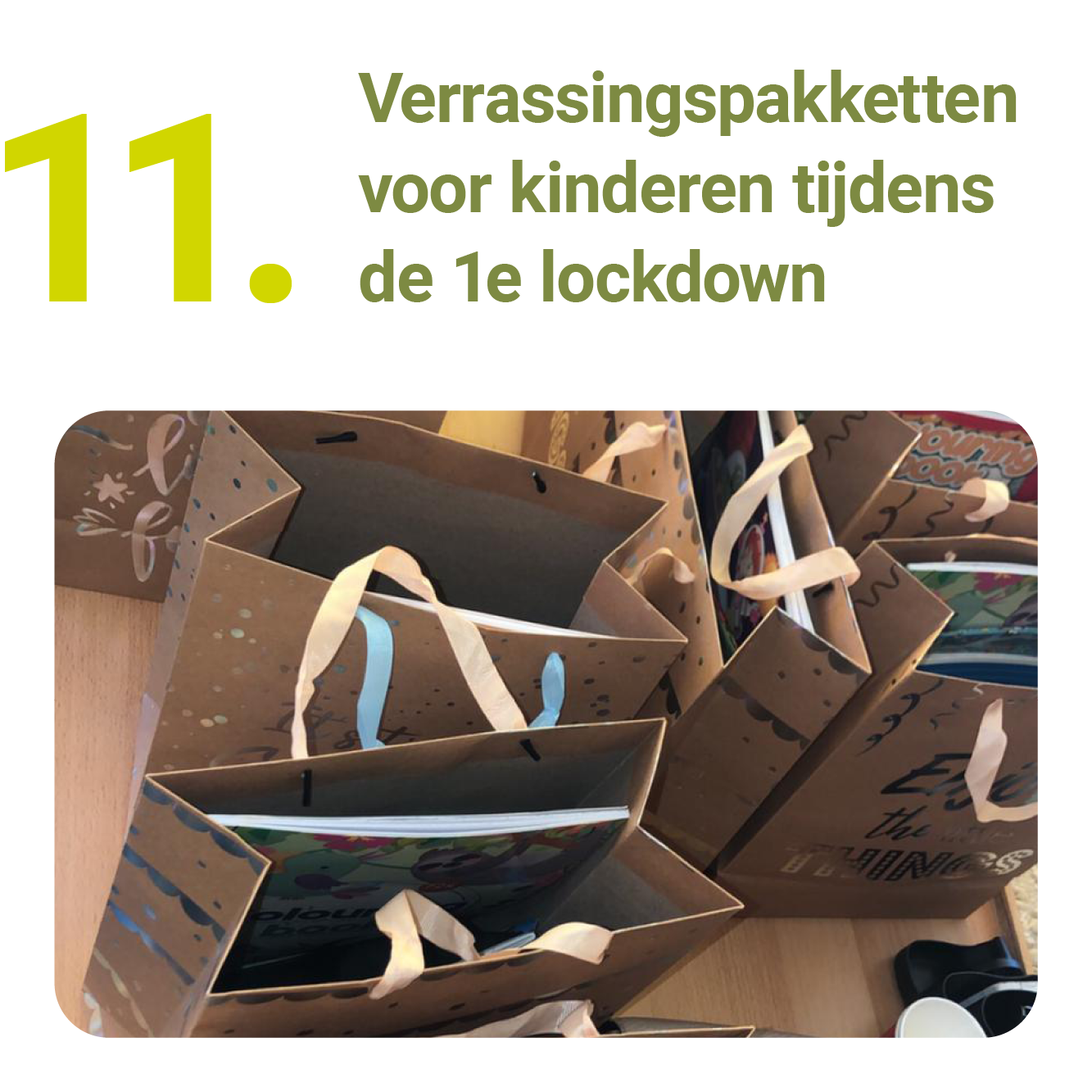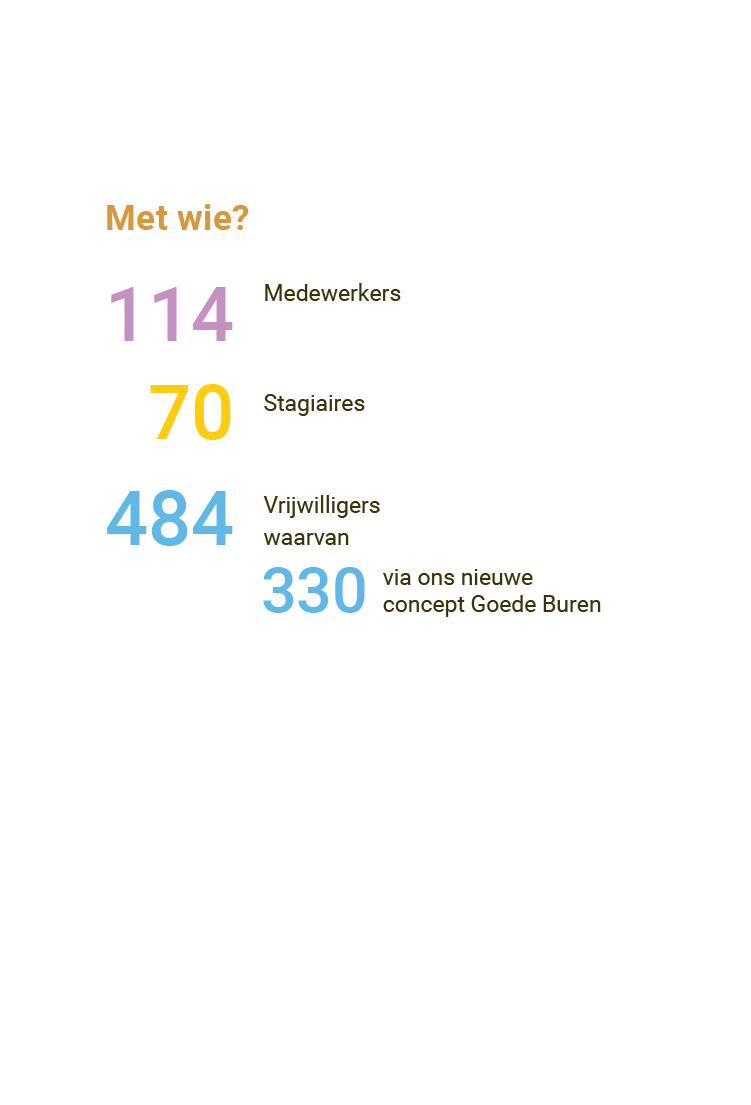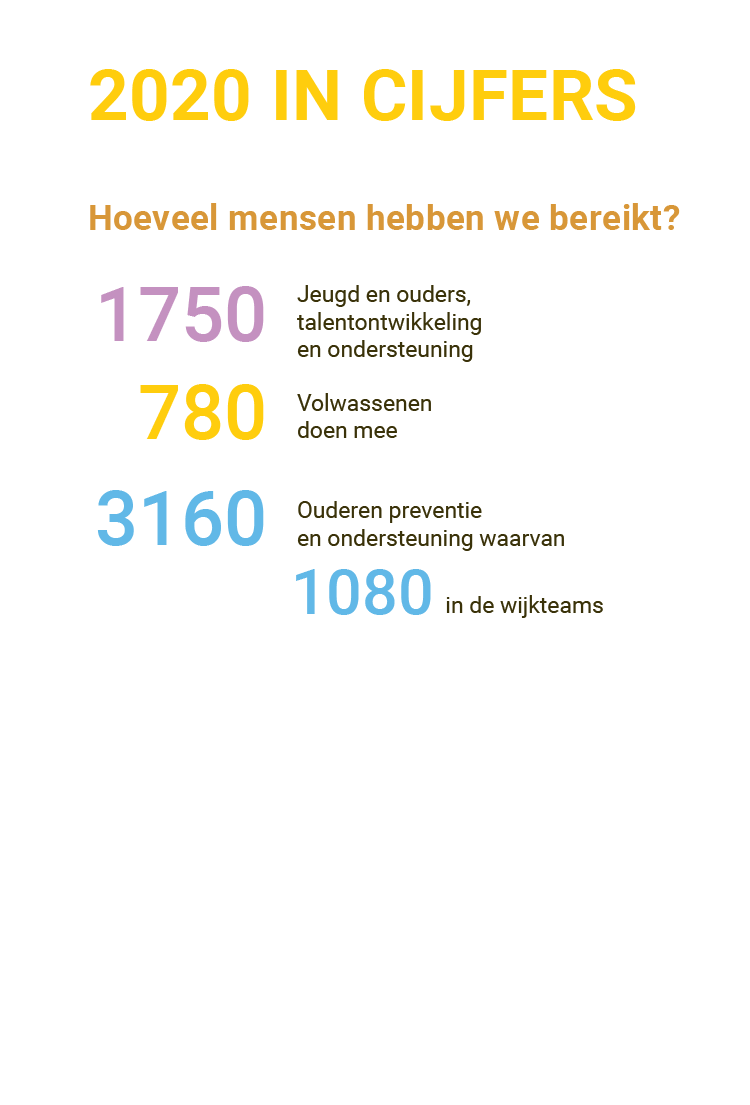 Honderden afhaalmaaltijden, bloemen, chocolaatjes, kaarten, boekjes en telefoontjes. Onmiddellijk optuigen van een telefonische hulplijn, GoedeBurenBuurt opschalen, vrijwilligers mobiliseren en zorgen voor een continue bemanning van de Even Kletsen Lijn. Online challenges en vlogs voor jongeren bedenken, noodopvang regelen voor het onderwijs, belafspraken met de deelnemers van het Krachthuis en het Geheugenpaleis, filmpjes maken voor ouders en kinderen in het kader van Samen Leren en Opstapje, School Maatschappelijk Werkers die kwetsbare kinderen uitnodigen in een lege klas zodat ze elkaar toch nog even zien en Ouderen Maatschappelijk Werkers die eenzame ouderen voor de voordeur spraken, in het park of in de tuin.