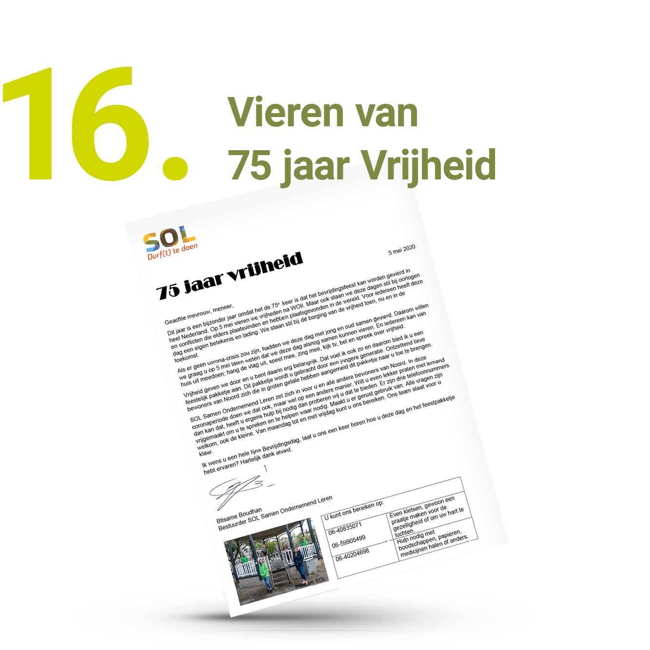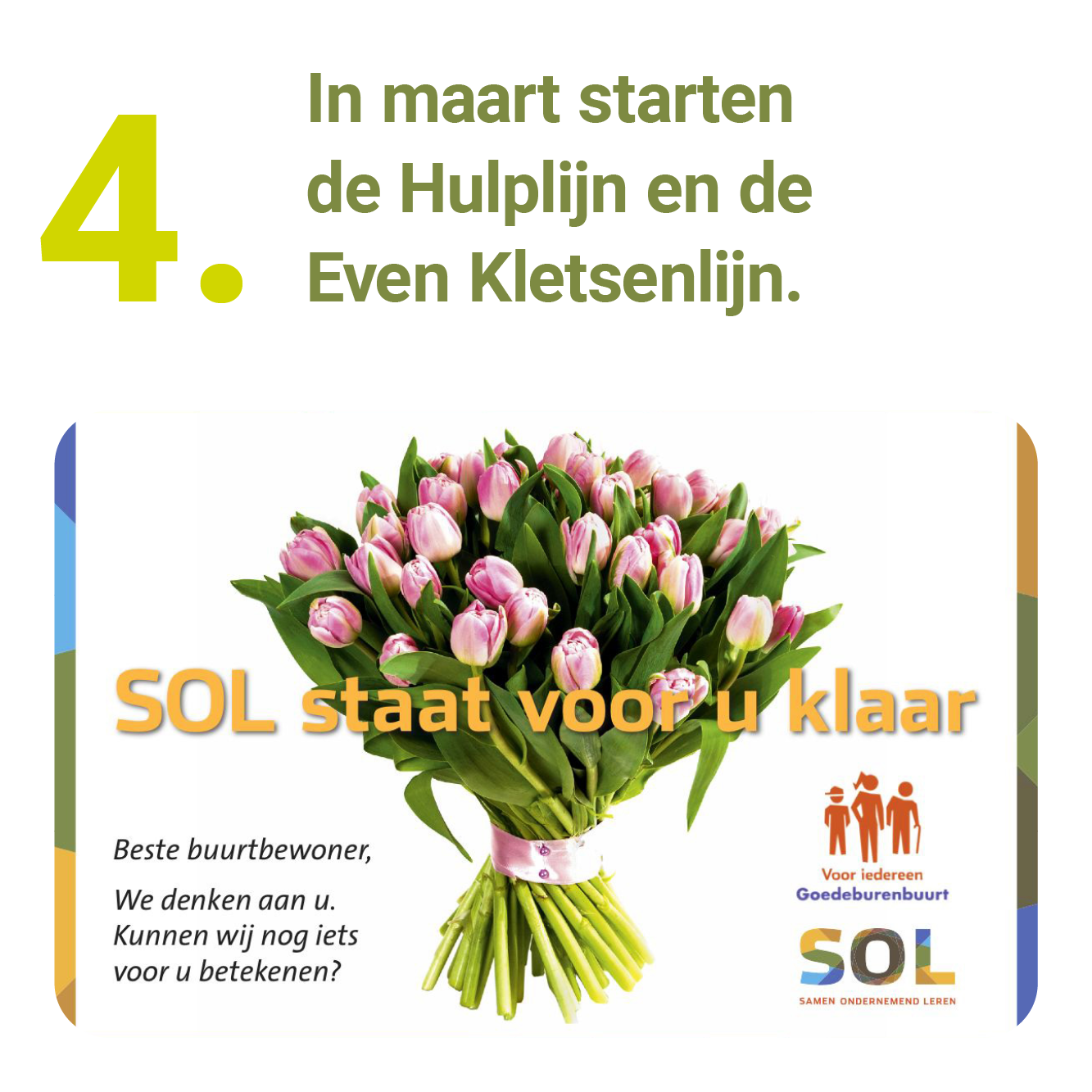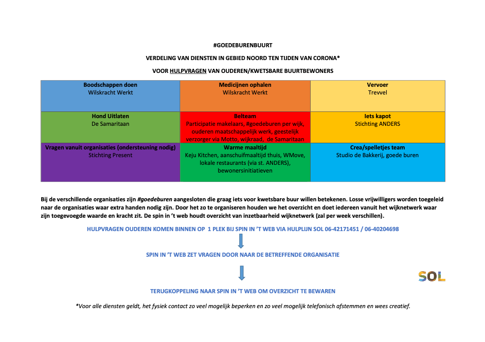 Een belangrijk motto voor alle SOL-medewerkers is: ‘Durf(t) te doen’. De samenwerking met wijkorganisaties vanuit de wijkteams hebben we dan ook op creatieve wijze voortgezet. Sowieso zijn onze medewerkers vaste ‘achterwacht’ voor de speciale diensten en activiteiten die welzijnsorganisaties dit jaar ontwikkelden in hun gebied. Zij informeerden zorg- en welzijnspartners telefonisch en schriftelijk over hun aanwezigheid en beschikbaarheid in de wijk. Daarnaast staken zij de handen uit de mouwen om de ondersteuning aan oudere wijkbewoners mee vorm te geven bij specifieke, corona gerelateerde diensten, voorzieningen en attenties.