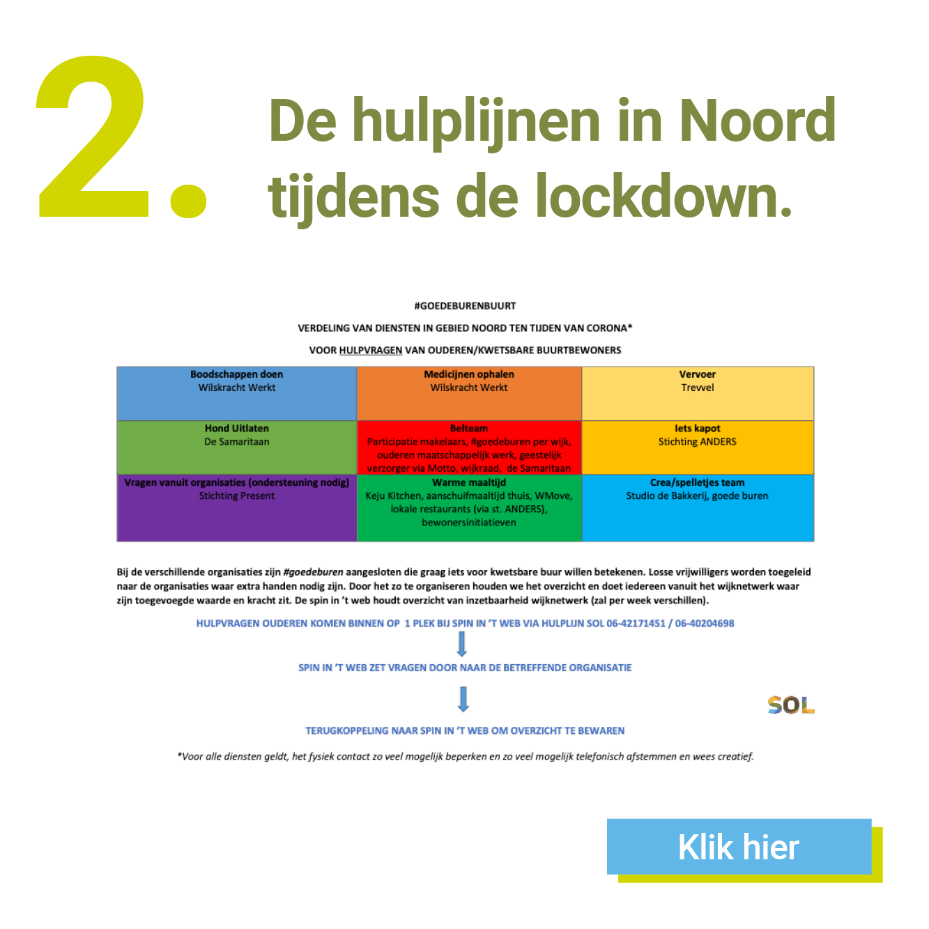 Meer dan 851 telefoontjes ontving het team van de SOL-hulplijn in 2020, gecoördineerd door de Spin in ’t web. Van bewoners die in de risicogroep vielen door hun leeftijd, gezondheid (fysiek of mentaal), hun financiële situatie of het gebrek aan een netwerk.