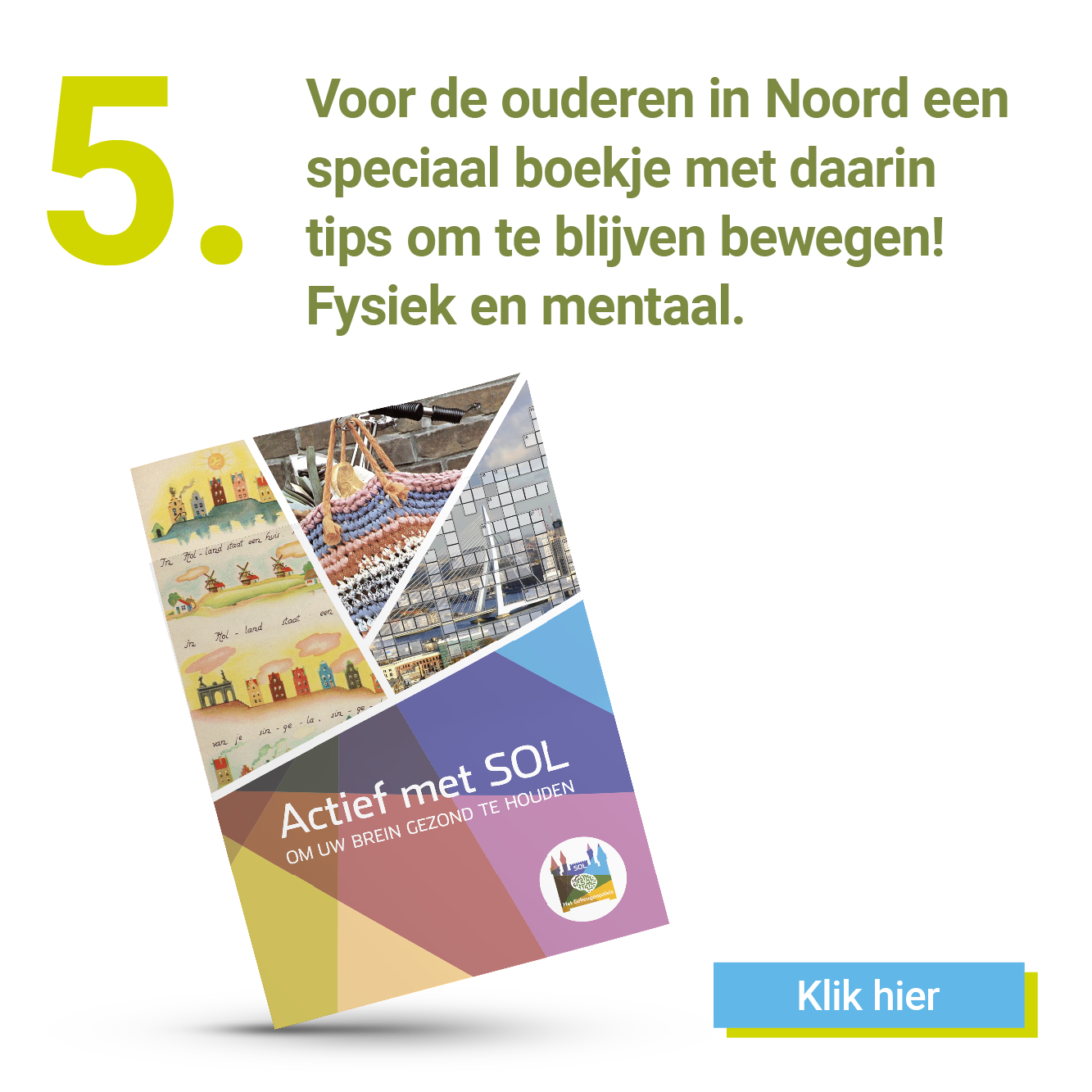 “Ouderen Maatschappelijk Werkers van SOL onderzoeken vanuit hun rol in de wijkteams, wat leeft bij de ouderen. SOL Ouderen Maatschappelijk Werkers Janneke Ariaans en Monique Buijs voerden gesprekken met vier ouderen aan de hand van drie instrumenten: het behandelpaspoort, de wensplaten en het wensenboekje.”