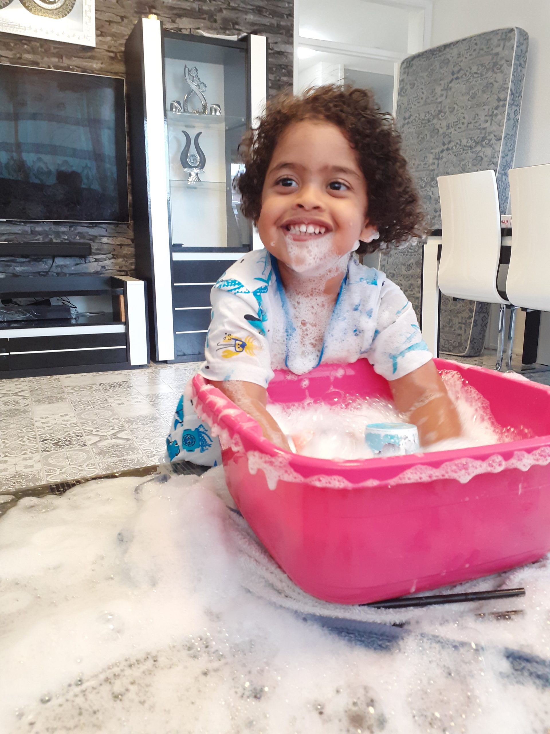 Sarah ontdekte rustig wat je allemaal kunt met water, door het gebruik van bekertjes, rietjes en sponsjes. Rustig water overgieten van de ene naar de andere beker. De beker leeggieten in de bak met water. Het water door je handen laten gaan. Bellenblazen met een rietje. Samen praten over wat er allemaal gebeurt. Na een tijdje was het tijd om wat zeep in het water te doen. Samen met moeder een klein beetje zeep toevoegen. Wat gebeurde er nu? Er ontstond schuim! Er waren ineens heel veel belletjes! Spetteren was nu nog leuker! Moeder liet haar kind zien dat je met het schuim ook een baard kon maken! Wat een pret! En dat het water op tafel kwam, dat maakte niet uit. Daarna samen het geknoeide water weer opruimen met een handdoek was namelijk ook weer een leuke activiteit.