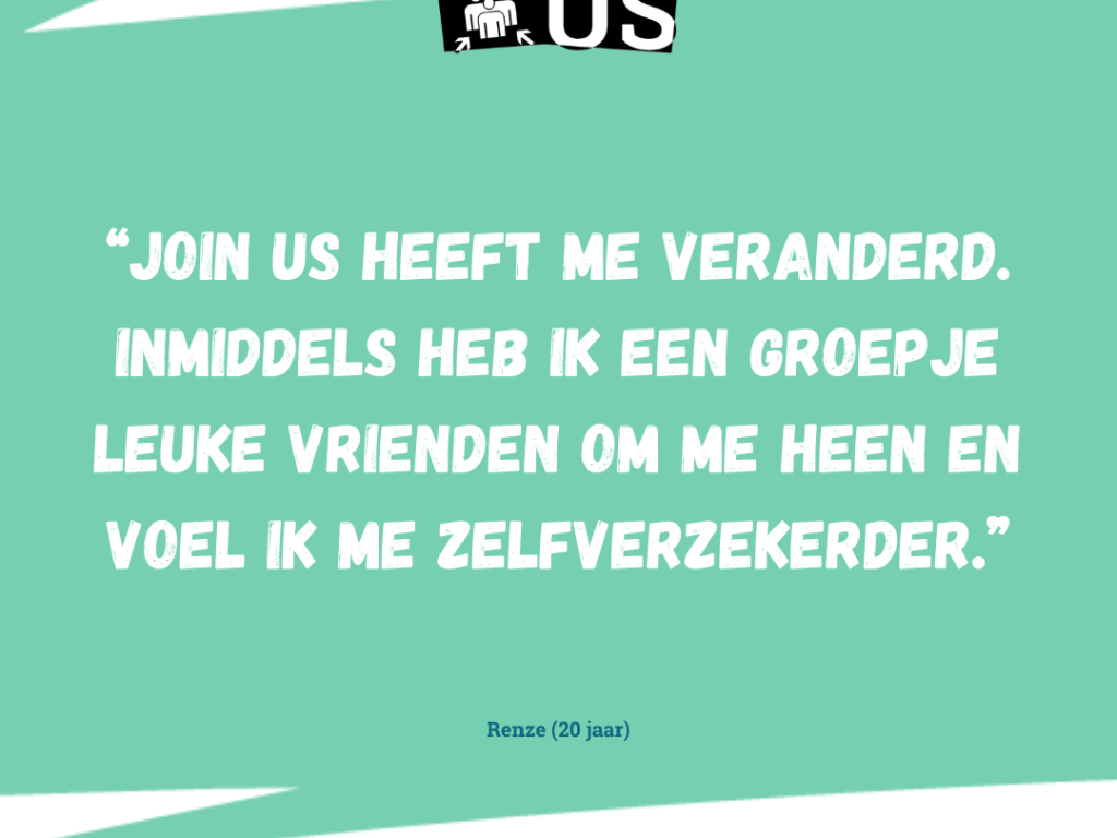 Lola-Kay vertelt over haar deelname aan Join Us. “Ik had het gevoel dat niemand me leuk vond en dat ik niet goed genoeg was. Ik heb toen op internet gezocht of er iets bestond waar je vrienden kon maken ofzo. Zo kwam ik bij Join Us.” Inmiddels is Lola-Kay uitgestroomd en blikt ze terug. “Bij Join Us kun je altijd jezelf zijn en je kunt er ook een stuk zelfverzekerder van worden. Ik merkte bij Join Us dat ik wél goed genoeg was en kan nu op andere plekken ook beter laten zien wie ik ben.”