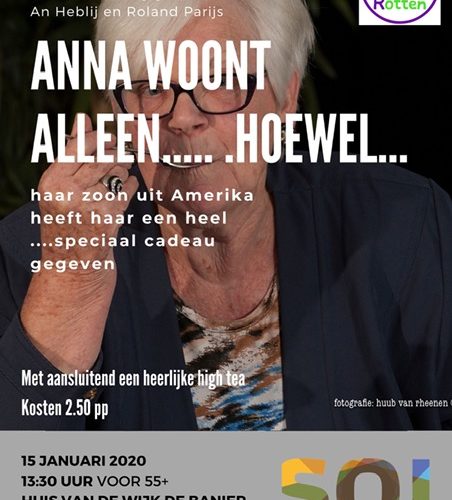 Op woensdag 15 januari nodigen wij u uit voor de voorstelling over Anna! De oudere dame Anna woont alleen… Dit verandert nadat haar zoon uit Amerika haar een speciaal cadeau geeft. Maar wat is het mysterieuze cadeau? Bent u net als wij benieuwd? Kom dan aanstaande woensdag naar Huis van de Wijk De Banier, Banierstraat 1, aanvang 13.30 uur. Kosten kaartje € 2,50. Na afloop genieten we samen van een heerlijke high tea!