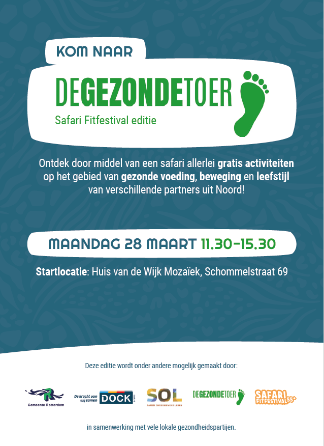 Ga je mee op safari? Samen met onze partners organiseren we op maandag 28 maart, van 11.30 tot 15.30 uur, de Safari Fit festivaleditie van de Gezonde Toer. Een festival dat geheel in het teken staat van gezondheid: mentaal en fysiek. Ga mee op deze ludieke, leuke en leerzame Safari door het Oude Noorden en check hoe gezond je bent!